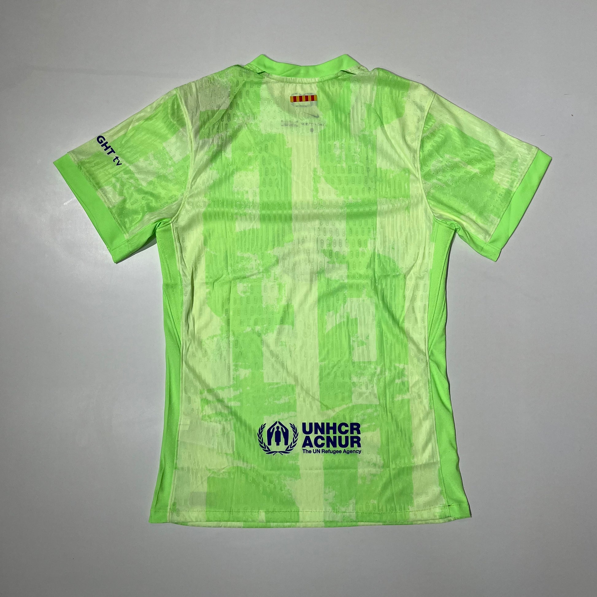 Design audacieux : Couleur verte néon vibrante, avec des détails en bleu et rouge, représentant les couleurs emblématiques du club.